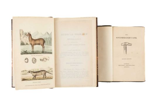 ANTIQUARIAN (MEDICAL): STEPHENSON (JOHN). Medical Zoology, and Mineralogy; or illustrations and descriptions of the animals and minerals employed in medicine, and of the preparations derived from them: including also an account of animal and mineral poisons, rebound in brown half calf gilt with marbled boards, 1st edition, London: John Wilson, 1832, 46 lithograph plates mostly hand-coloured (some mineral illustrations are heightened with a metallic/iridescent finish), one double page, tissue guards, later endpapers, some light spotting, a little rubbed, contemporary booksellers pencil notes to endpapers, 8vo; MACMICHAEL (WILLIAM) The Gold-Headed Cane, [medical biographies], 2nd edition, London: John Murray 1828, 8vo, untrimmed, twice owner inscribed in ink dated 1887 and 1941, frontis bound at p.200, half morocco with marbled boards, gilt titled spine in raised compartments, 8vo, spine rubbed corners rubbed etc, together with, ASSORTED WELSH INTEREST BOOKS, including KILVERT (FRANCIS) Kilvert's Diary, ed William Plomer, London, Jonathan Cape, 1971, 3 vols, original cloth backed boards gilt, d/ws; PENNANT (THOMAS) Teithiau Yn Nghymru, 1st Welsh edition, 46 pls, rebound red cloth gilt spine later pastedown and flyleaf, half title and portrait frontis present, subscribers list, adverts, engraved plates; PENNANT (THOMAS) British Zoology, London: printed by William Eyres for Benjamin White, vol IV (Crustacea, Mollusca, Testacea) only, 1777, engraved and printed titles, 8vo, 94engraved plates, contemporary rebound; DAVIES (HUGH) Welsh Botanology, London: Marchant, Ingam-Court et al., 1813, historic owner inscribed in ink dated 1856 to title, late library stamp, 2 parts in 1 vol, rebound in half calf with marbled boards, foxing, toning; SALESBURY (WYLLYAM) A Dictionary In Englyshe And Welshe, brown cloth gilt, 8vo, spine tears, hinge cracked etc (qty.)Provenance: private collection CardiffComments: inspection advised