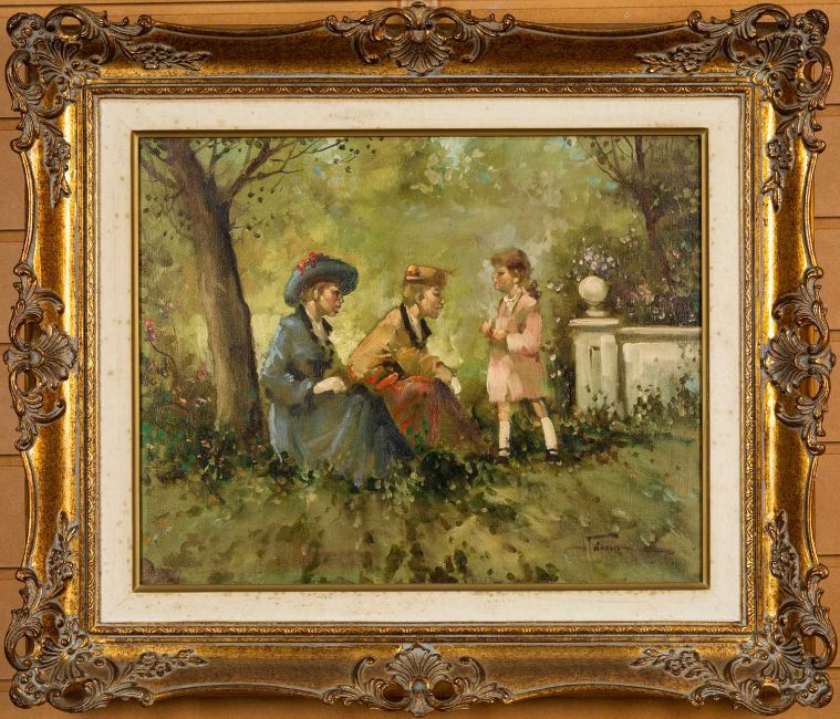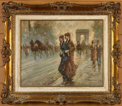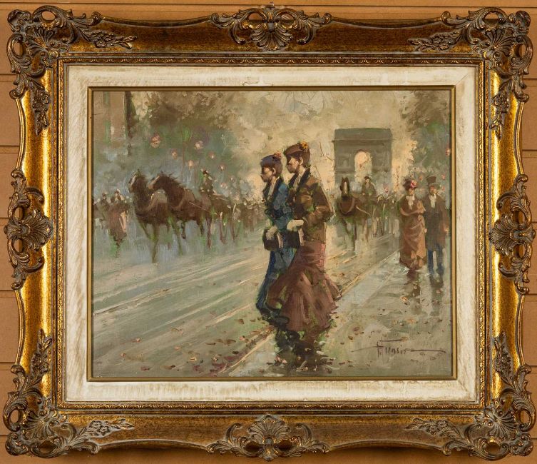 ‡ TOMMASO PRINCIPE (Italian, b. 1942) 4 oil on canvas - entitled 'Il Parco', figures near a park bench; 'Una Passeggiata', figures and carriages on the Champs-Élysées; 'Il Parco', three figures seated beneath a tree; 'Neve in Città', all signed, all 40 x 50cms (4)Provenance: private collection CardiffComments: frame mounts slightly water stained/discoloured