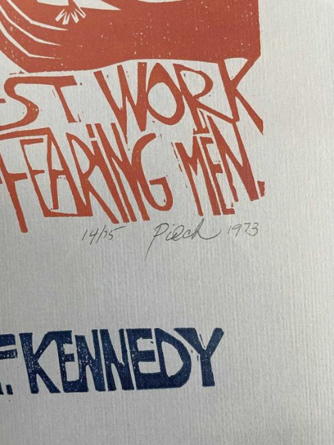 ‡ PAUL PETER PIECH (American, lived / worked Wales, 1920-1996) woodcut prints - a collection of three prints, the first limited edition (23/50) a crucifixion scene with the slogan, 'Ye Shall Know the Truth and the Truth Shall Make You Free', signed and dated 1974, 76 x 51cms, a smaller limited print (14/25) with a quote from John F. Kennedy, 'The Making of Peace..', signed and dated 1973, 45 x 29cms and a third unsigned print with a quote from English poet John Donne, 'No Man is an Island..', 64 x 45cms this lot also contains hand written receipts and exhibition flyers from the artistProvenance: with hand written receipts by the artist from the artist's studio thanking for the purchases, private collection WiltshireComments: the larger print has a tear at the top, all three show signs of creasing, all unframed