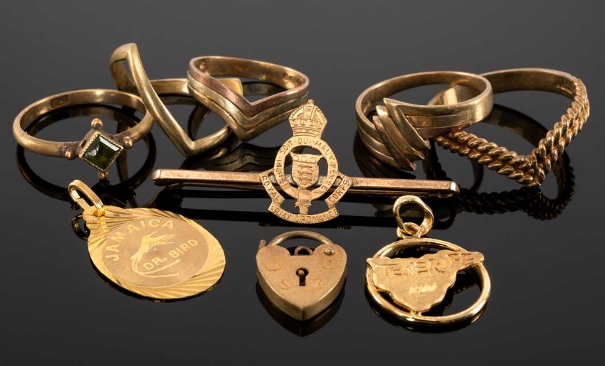FIVE ASSORTED 9CT GOLD RINGS, together with 9ct gold padlock clasp, 13.2g; Royal Army Ordnance Corps bar brooch; 14ct gold Jamaica pendant, 1.1g; 18ct gold Tenerife pendant, 1.5g; (8)Provenance: private collection Gwynedd