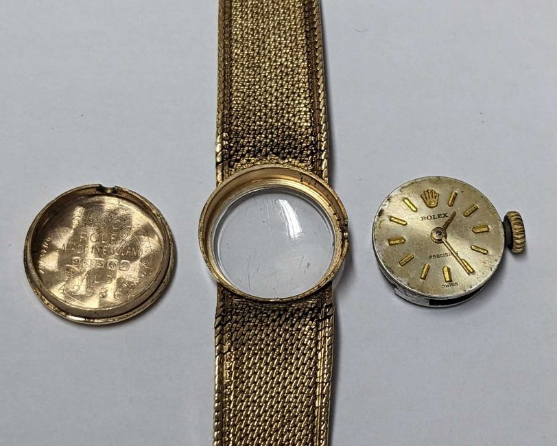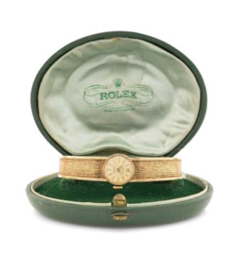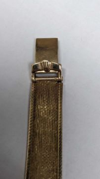 ROLEX PRECISION LADIES' 9CT GOLD BRACELET WATCH, Ref. 60804, ser. 425866, Cal. 1401 18J manual wind movement, baton hour markers, integral mesh link bracelet with deployant clasp, dial, movement, case signed, 20mms (diam.), gross wt. approx. 19.7gProvenance: private collection CardiffComments: dial crazed, crystal scratched, bracelet damaged at lugs, working at time of cataloguing.