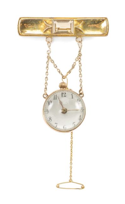 GERMAN BALL WATCH, 30mms (diam.), suspended from a German 8k gold quartz-set bar brooch.Provenance: consigned from SwanseaComments: watch - dial cracked, brooch - probably associated, gilding worn