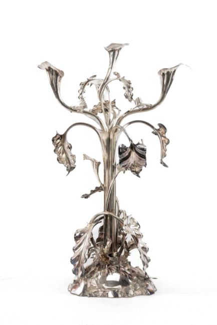 IMPRESSIVE ELKINGTON FOUR-LIGHT ELECTROPLATED CANDELABRUM, modelled as flowering lilies with the flowers as candleholders, large heart-shaped leaves and naturalistic base, 69cms hProvenance: private collection GlamorganComments: good overall.