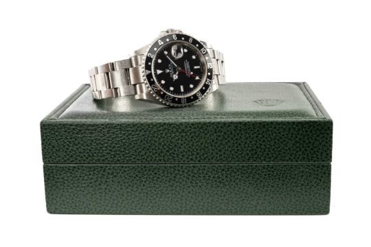 ROLEX STAINLESS-STEEL AUTOMATIC GMT MASTER II BRACELET WATCH, ref: 16710, ser. P271*, 2000, black dial with luminous dot hour markers, date aperture, red 24-hour hand, case with protected screw-down crown, black insert 24 hour bi-directional rotating bezel, screw-down back, Rolex stainless-steel oyster bracelet with deployant clasp numbered 78790A and date code letter AB9 for 2001, with Rolex boxes, guarantee paperwork, booklets, calendar card 2001/2, card holder, purchase receipt dated 2004, 40mms (diam.)Provenance: private collection CardiffComments: ordinary used condition, dial clean, crown tube-threaded correctly, bezel with surface scratches, deeper scratch to metal at numeral 6, hands adjust as normal and running at time of cataloguing, bracelet light surface scratches, crystal tiny chip to centre, inspection advised, case back unopened.