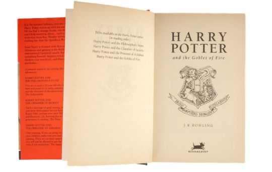ROWLING, J. K. HARRY POTTER AND THE GOBLET OF FIRE, First Edition, signed by the author J. K. Rowling, hardback, London: Bloomsbury, 2000, with dust-jacket and 'golden ticket' for the Ball Room Edinburgh signing on 10th July (2000)Provenance: private collection Pembrokeshire, bought new and signed shortly after at Edinburgh book signingComments: name in ink appears on line 'this book belongs to', a good clean example, toning to pages as expected, some edge bumps and minor stain, ticket has name of owner verso, viewing highly recommended