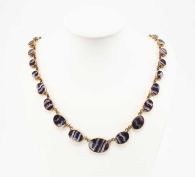 9CT GOLD BLUE JOHN NECKLACE & EARRINGS, the necklace comprising 27 graduated oval pieces of Blue John encased in 9ct gold settings, 42cms long, with matching pair of earrings, 34.3g gross, in ASD Jewellers box with booklet and sales invoiceProvenance: private collection Carmarthenshire, by family descentComments: light wear overall commensurate with age / use, viewing recommended