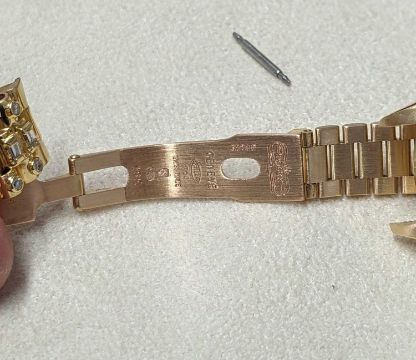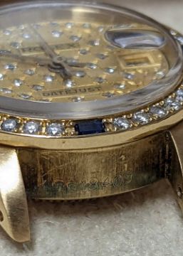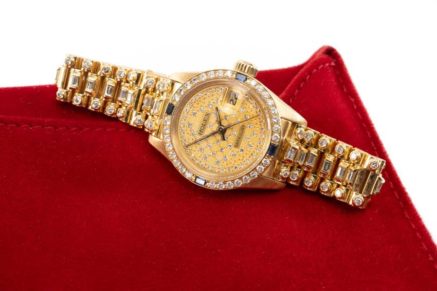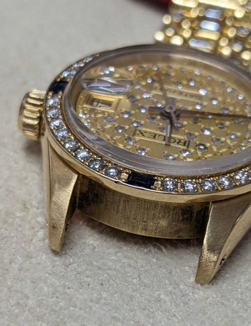 ROLEX LADIES' 18K GOLD OYSTER PERPETUAL 'DATEJUST' BRACELET WATCH, Ref. 6927, presumed Cal. 2020 28J automatic movement, ser. 7618***, 1983, after market dial and bracelet set with diamonds, diamond and sapphire set bezel, sapphire crystal, 18K president bracelet with B570F deployant clasp, 4 extra links, 25mms (diam.), 67.1gProvenance: private collection Neath Port TalbotComments: movement working at present, case in excellent condition, with some light scratches due to general use, bracelet in excellent condition, with light scratches, case back unopened. Jewellers receipt for repair/service dated 16.4.24, no box or papers.
