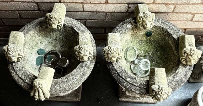 PAIR OF CONCRETE GARDEN URNS & OTHER ORNAMENTSProvenance: private collection Conwy
