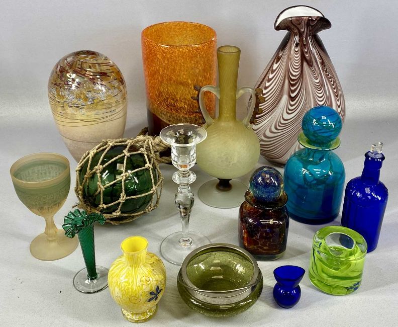 STUDIO GLASSWARE, including swirl glass vase, 30cms (h); two Medina decanters and stoppers, 20cms (h) the larger; Aaronson type art glass baluster vase, 23cms (h)Provenance: private collection Ynys Môn