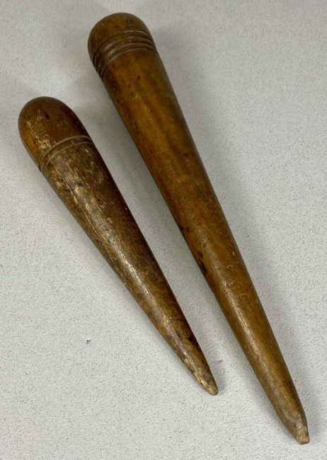 TWO EARLY 19TH CENTURY WOODEN SAIL/ROPE MAKER'S FIDS, 34 and 25cms (l)Provenance: private collection Ynys Môn