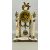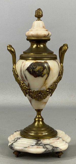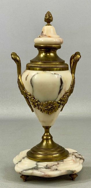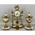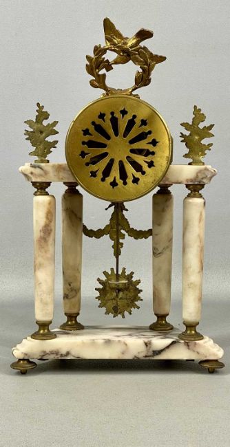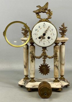 FRENCH MARBLE & GILDED BRASS CLOCK GARNITURE, 19th century, clock having barrel movement surmounted with a bird, enamelled dial decorated with floral swags and Arabic numerals, four columns to the shaped base, sunburst mask head pendulum, 40cms (h); with a pair of matching urnsProvenance: private collection Conwy