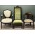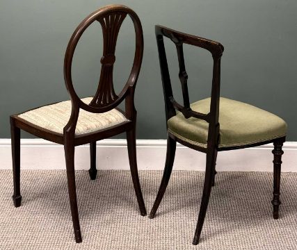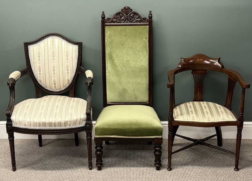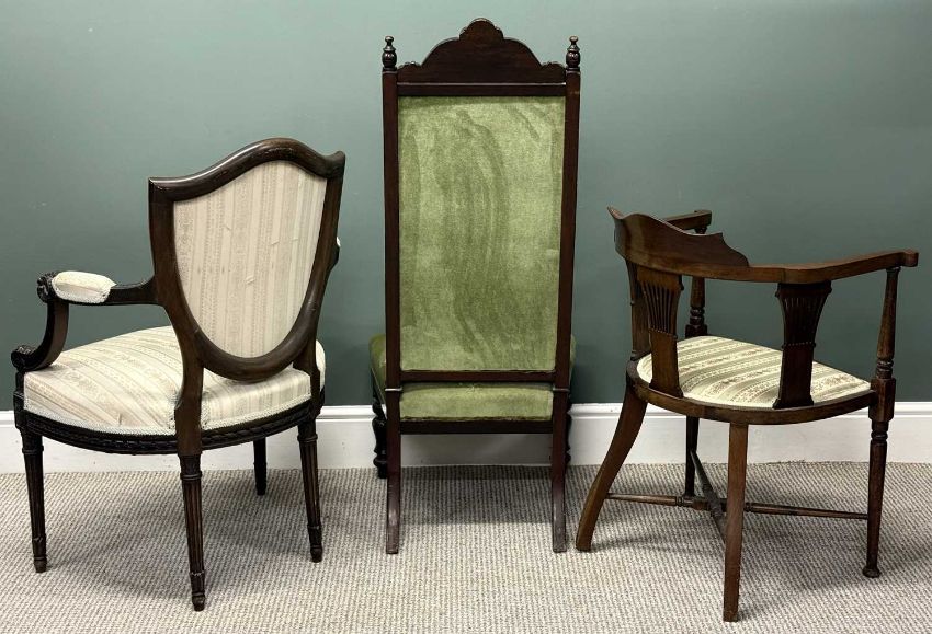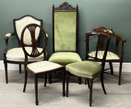 SEATING PARCEL, including mahogany framed shield back chair with upholstered back, armrests, and seat, and with carved rams head arm terminals; Edwardian inlaid mahogany tub chair; mahogany shield back bedroom chair; and two othersProvenance: deceased estate Conwy