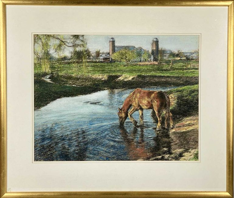 ‡ KEITH BOWEN (Welsh, b. 1950) pastel - horse watering, farm beyond with twin silos, unsigned, 47 x 62cmsProvenance: private collection ConwyComments: framed and glazed