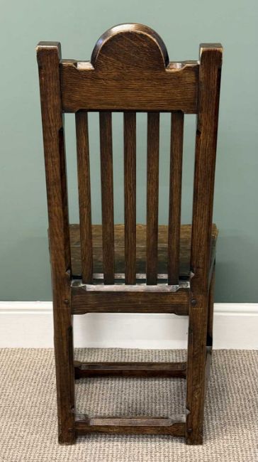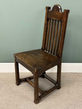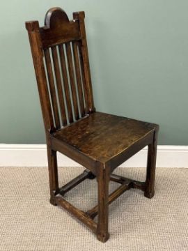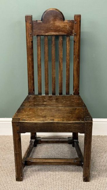 PEGGED OAK HALL CHAIR, arched top rail, rail back, solid two-piece seat, hewn supports and stretchers, 104 (h) x 50 (w) x 43cms (d)Provenance: private collection Conwy
