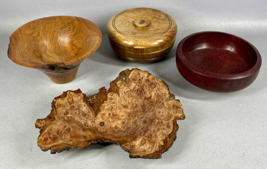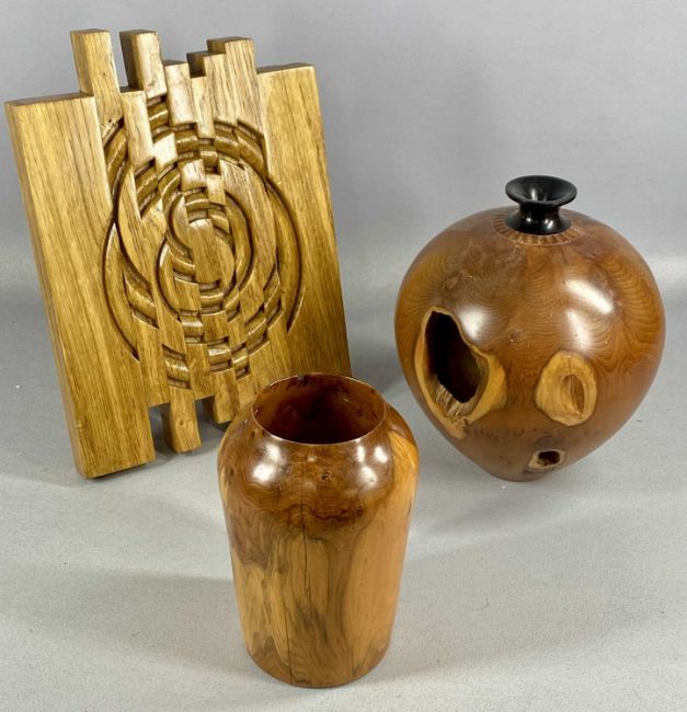 HAND-CRAFTED TREEN, including silver birch dish, signed 'Campbell', 32 x 26cms; Anglesey yew vase, monogrammed 'J. H.' on base, 19cms (h); yew bottle vase, 25cms (h); Kath Stanley oak sculpture entitled 'Overtures in Oak', signed and dated 2014 verso, with yew easel back, 34 x 24cms, etc.Provenance: private collection Ynys Môn