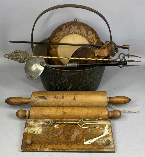 ANTIQUE & VINTAGE KITCHENALIA, including circular brass skillet with steel handle, 31cms (diam.); wooden bread plate with poker work decoration, 25cms (diam.); two wooden rolling pins; metal ladle with ebonised handle, etc.Provenance: private collection Conwy