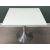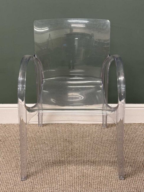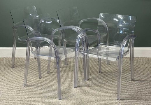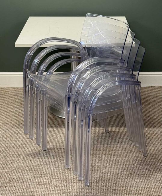 RETRO STYLE TABLE & CHAIR SET, the table with square white Formica top and brushed steel tulip base, 75 (h) x 90cms²; four transparent polycarbonate open armchairs, 80 (h) x 57 (w) x 44cms (d)Provenance: private collection Conwy