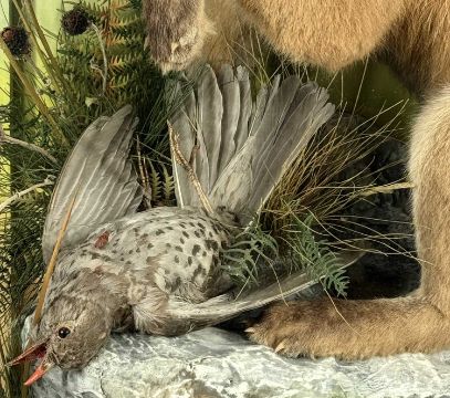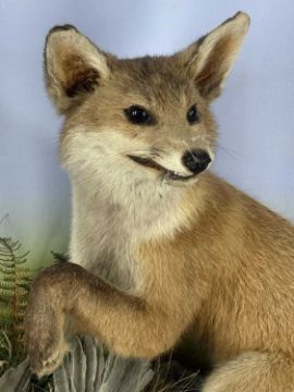 TAXIDERMY YOUNG FOX WITH THRUSH PREY, in glazed case with naturalistic setting, manner of Hutchings of Aberystwyth, 67 (h) x 48 (w) x 27cms (d)Provenance: private collection Conwy