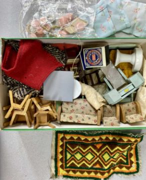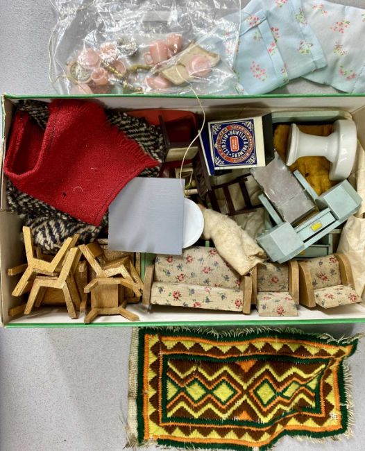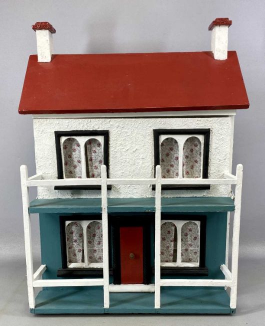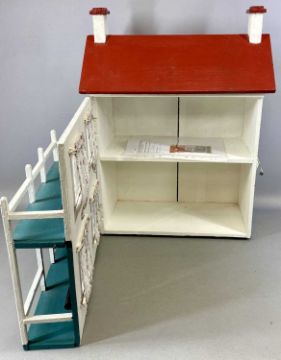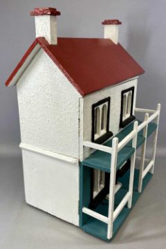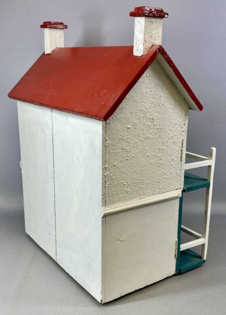 PAINTED WOODEN DOLLS' HOUSE with various furnishings, made by Dr William 'Willie' Smyth, lecturer in Classics at Swansea University in 1940s/50s, shared a flat and was a close friend of Kingsley Amis, who referred to him in his memoirs. Made out of a WWII orange box and leftover wood.Provenance: private collection Flintshire