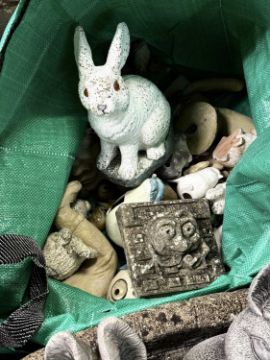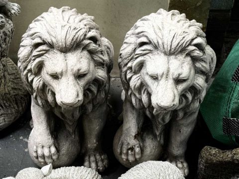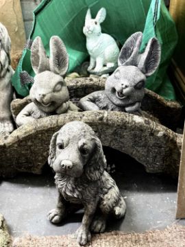 ASSORTED GARDEN ORNAMENTS in concrete and plastic, including pair of lions, dogs, and other animals; together with a solar powered water featureProvenance: private collection Conwy