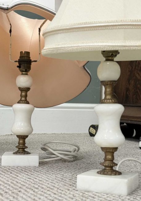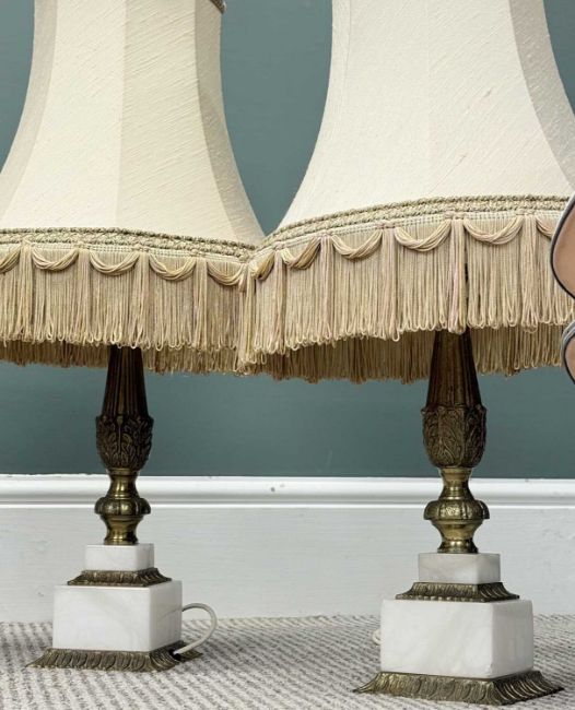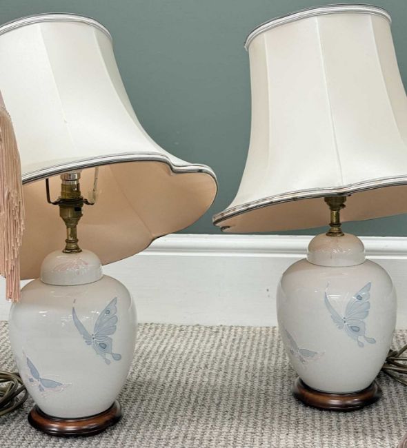 ASSORTMENT OF DECORATIVE TABLE LAMPS, including alabaster and gilt metal pair with fringed fabric shades, 58cms (h); figural lamp with brass column and fringed apricot fabric shade, 59cms (h); pair of baluster ceramic decorated with butterflies and with silk fabric shades, 53cms (h), etc. (9)Provenance: private collection Shropshire