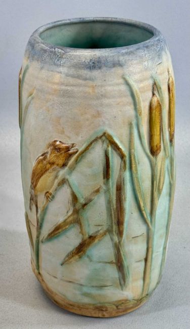 ASSORTED CERAMICS, including Doulton Lambeth pottery 'Improved Foot Warmer'; Bourne Denby vase decorated in relief with bullrushes and bird, 29cms (h); Sylvac 1958 green glazed acorn jug with squirrel handle, 19cms (h); and German stoneware schnapps flask, 30cms (h)Provenance: private collection Conwy