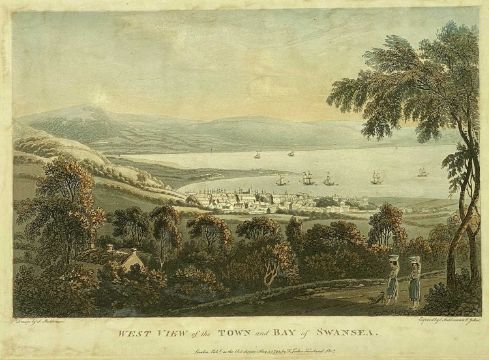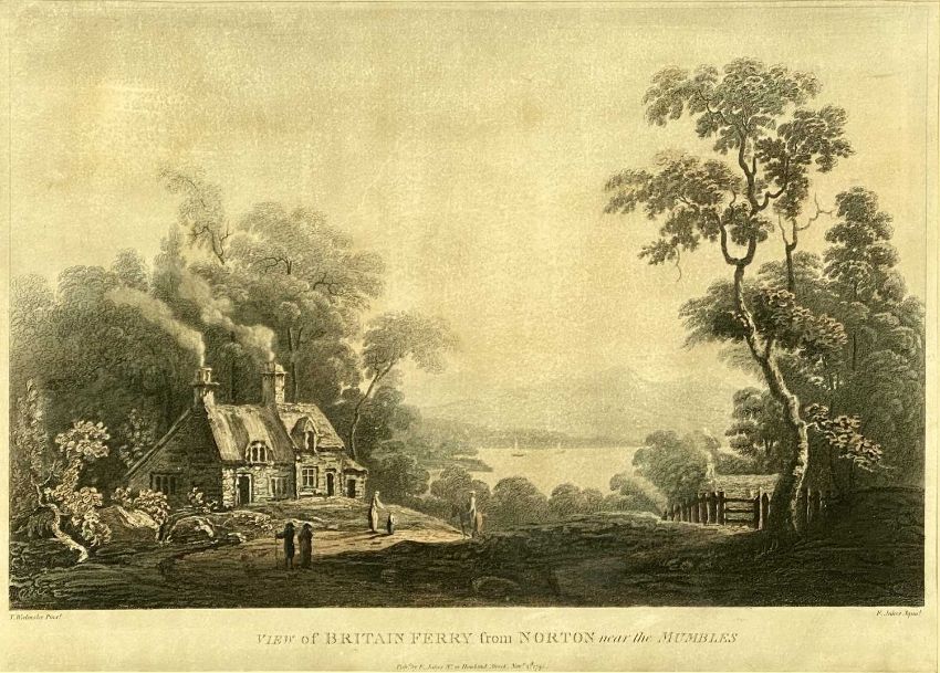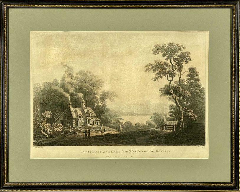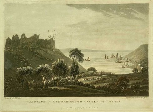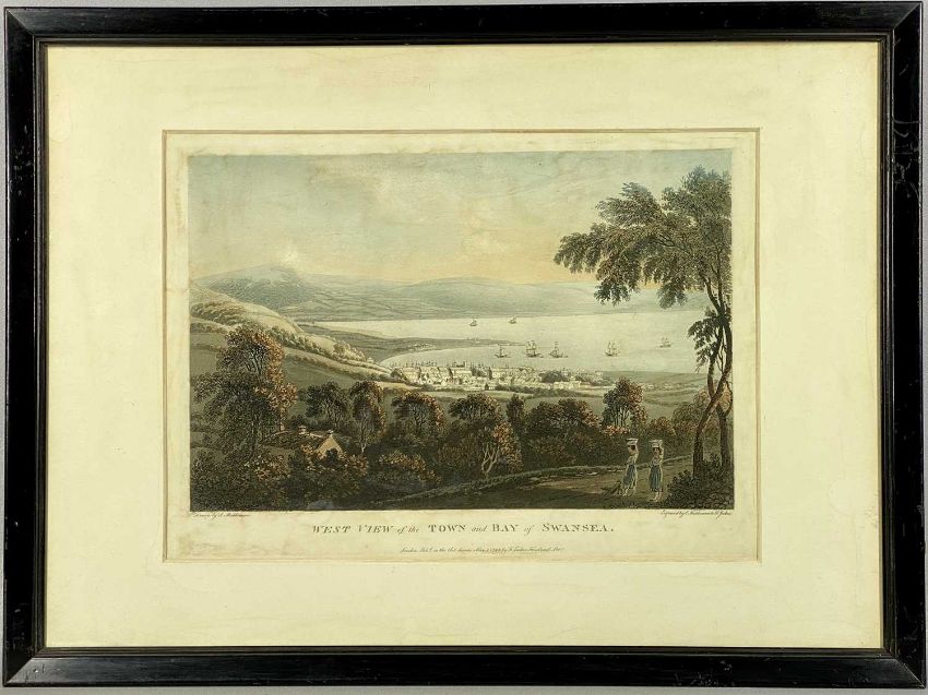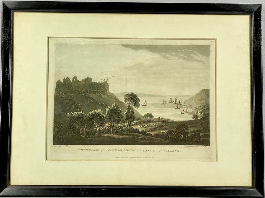 MIDDIMAN & F. JUKES pair of hand-coloured engravings - 'West View of Oystermouth Castle and Village' and 'West View of the Town and Bay of Swansea', published London 1792, 28 x 39cms; and T. WALMSLEY & F. JUKES aquatint - 'View of Britain Ferry from Norton, Near the Mumbles', 26.5 x 37cms (3)Provenance: private collection FlintshireComments: all framed and glazed