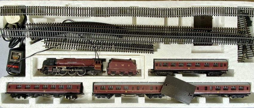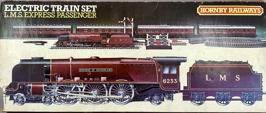 HORNBY RAILWAYS LMS EXPRESS PASSENGER ELECTRIC TRAIN SET, locomotive Duchess of Sutherland, with tender, four carriages, sections of track, and transformer, boxedProvenance: private collection Gwynedd