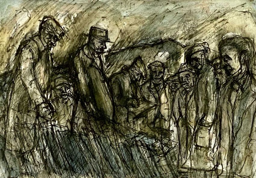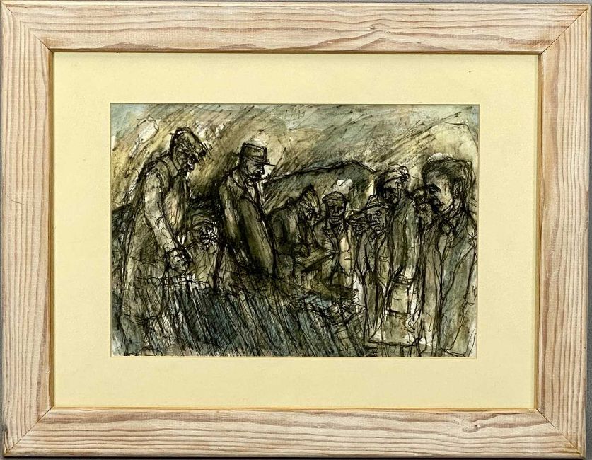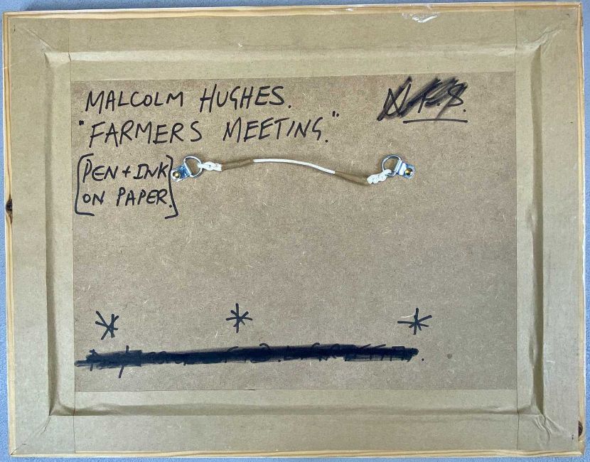 ‡ MALCOLM HUGHES pen and ink on paper - entitled verso 'Farmers Meeting', 19.5 x 28.5cmsProvenance: private collection ConwyComments: framed and glazed