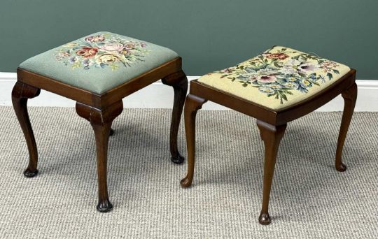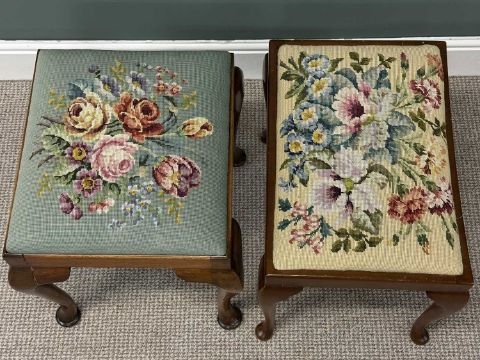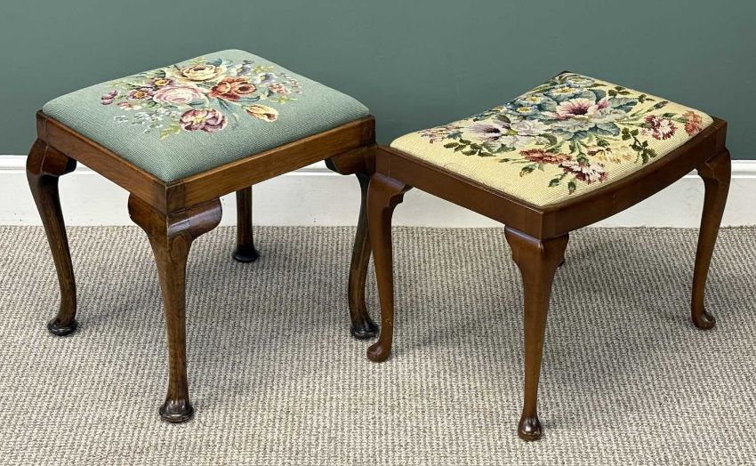 TWO MAHOGANY DRESSING STOOLS, floral woolwork seats, cabriole supports, 44 (h) x 54 (w) x 38cms (d) the largestProvenance: private collection Gwynedd