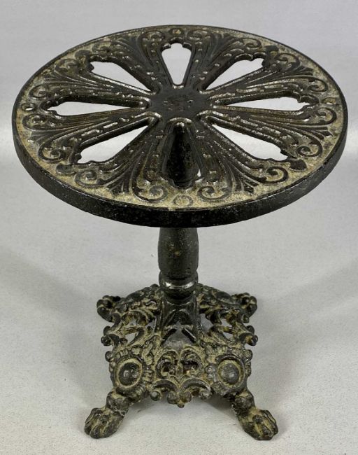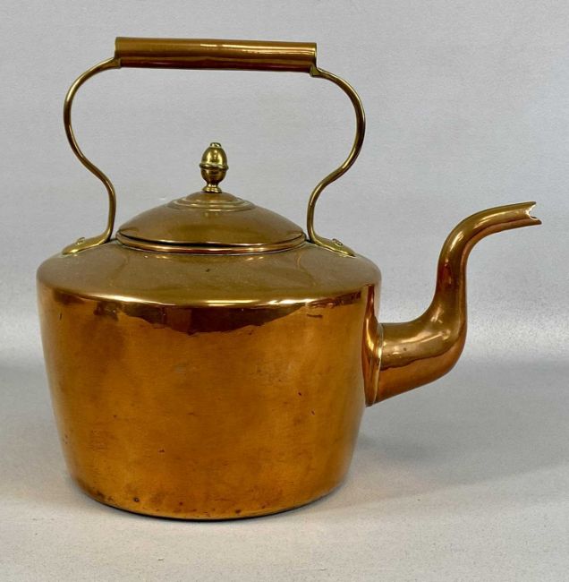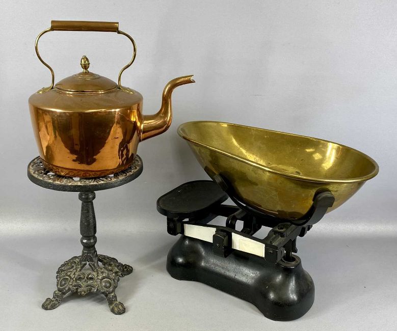 ASSORTED METALWARE, 19th century and later, including large cast iron grocer's scales with brass pan, circular copper kettle with acorn finial, and circular cast iron trivetProvenance: private collection Conwy