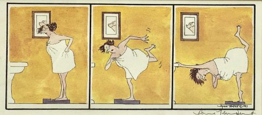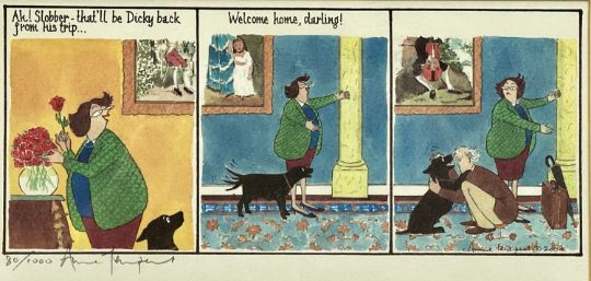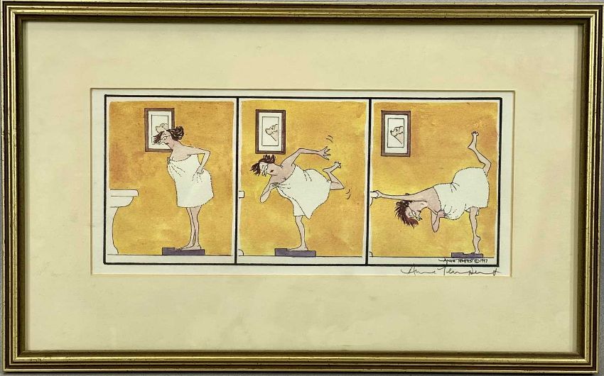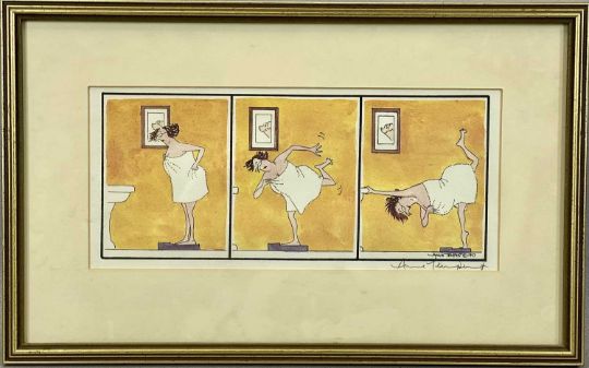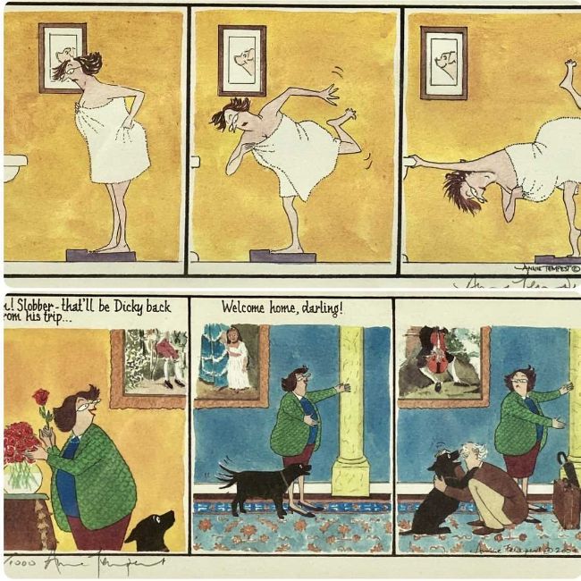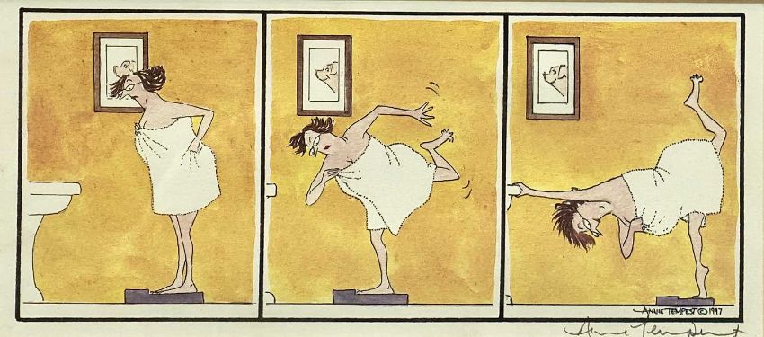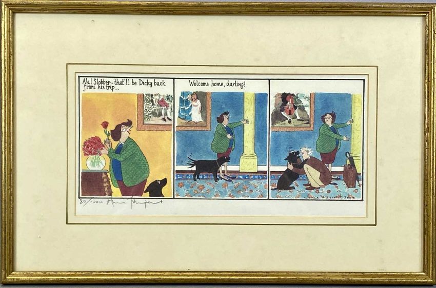 ‡ ANNIE TEMPEST (British, b. 1959) two colour lithograph cartoons from the Tottering-by-Gently series - (80/1000) 'Welcome Home' and 'Bathroom Scales', both signed in pencil, 13.5 x 28cms (2)Provenance: private collection ConwyComments: framed and glazed