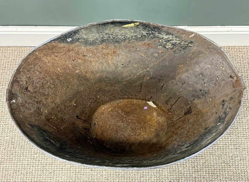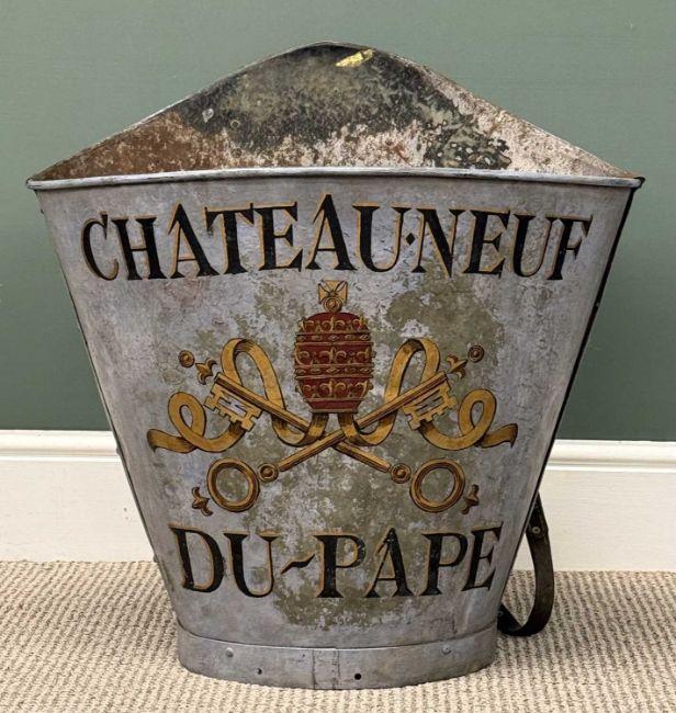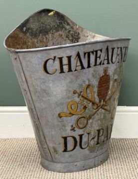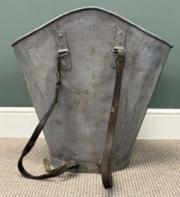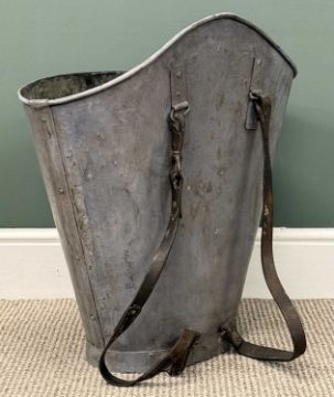 VINTAGE GALVANISED METAL GRAPE PICKERS HOD, Châteauneuf-du-Pape, with leather shoulder straps, 64 (h) x 64 (w) x 36cms (d)Provenance: private collection Conwy