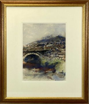 ‡ ROB PIERCY (Welsh, b. 1946) watercolour - stone bridge over river with mountain beyond, signed lower right, 35.5 x 26.5cmsProvenance: private collection GwyneddComments: framed and glazed