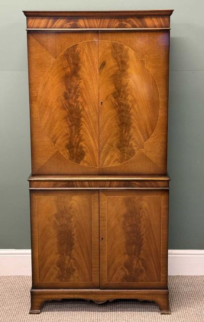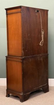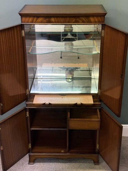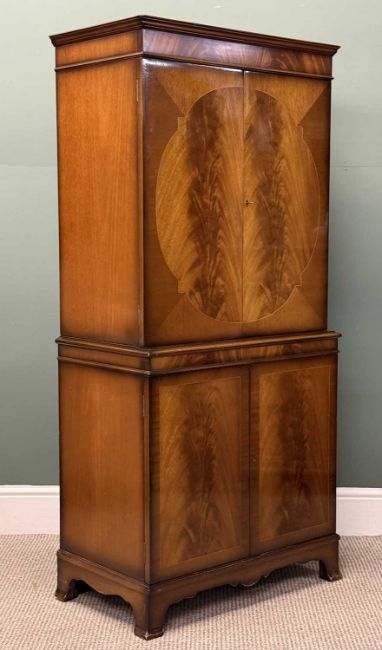 REPRODUCTION MAHOGANY COCKTAIL CABINET, upper section having mirrored back and base, shelved interior over pull-out chopping board, base with double cupboards enclosing shelf and a drawer, 153 (h) x 71 (w) x 42cms (d)Provenance: private collection Shropshire