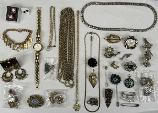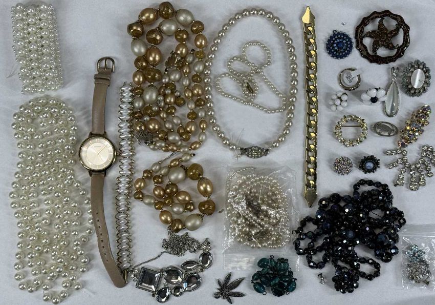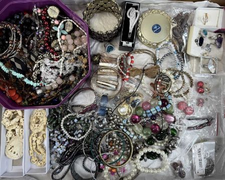 VINTAGE COSTUME JEWELLERY, including gold tone bracelets and chains, simulated pearls, various beads, etc.Provenance: private collection Gwynedd