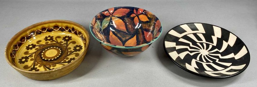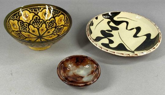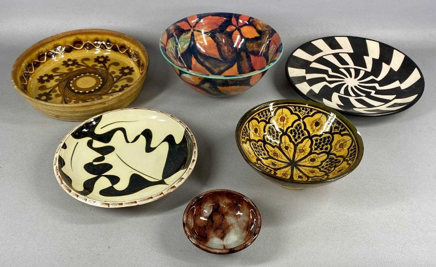 ASSORTED 20TH CENTURY CERAMICS, including Ewenny Pottery bowl with brown marbled glaze, 12.5cms (diam.); Millhouse Pottery style slip glazed bowl, 29cms (diam.); eastern glazed terracotta footed bowl, 22cms (diam.), etc.Provenance: private collection Ynys Môn