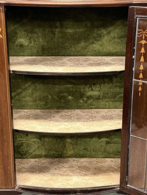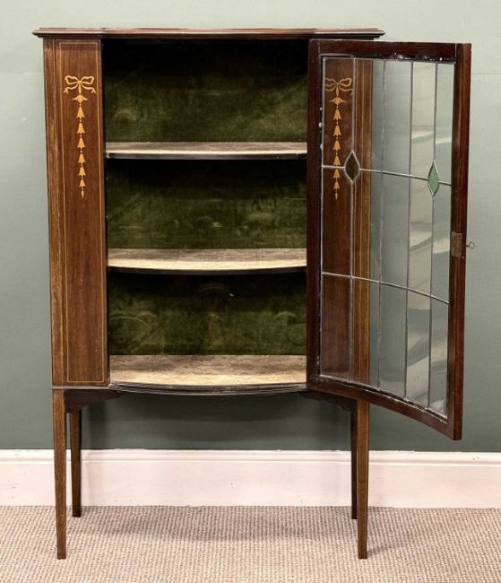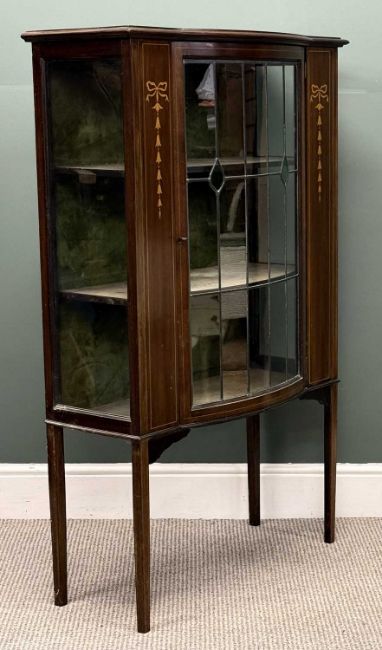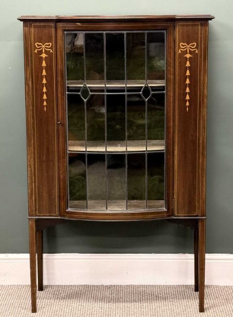 EDWARDIAN INLAID MAHOGANY DISPLAY CABINET, leaded glazed bow front door, tapered square supports, 135 (h) x 84 (w) x 38cms (d) maximumProvenance: private collection Ynys Môn
