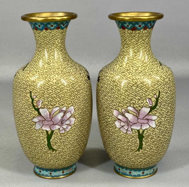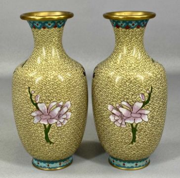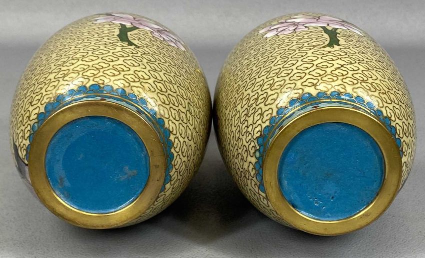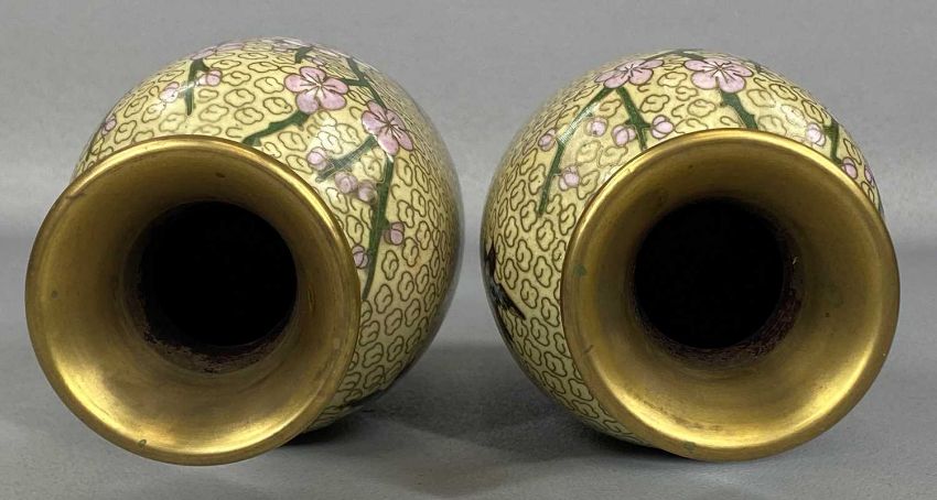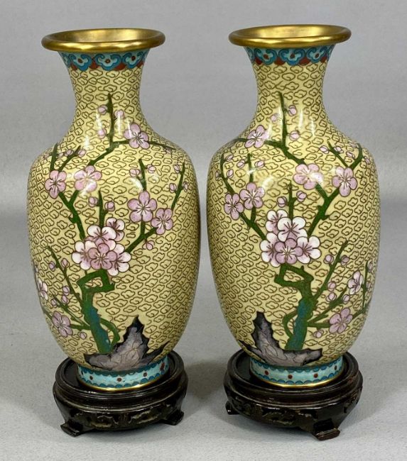 PAIR OF CHINESE CLOISONNÉ VASES, decorated with cherry blossom and birds, on carved wooden stands, 23.5cms (h)Provenance: private collection Denbighshire