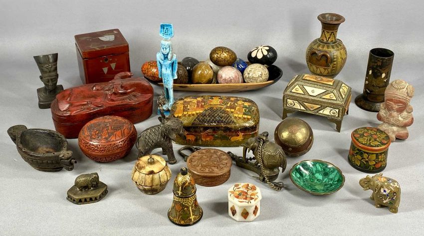 ASSORTED COLLECTABLES, including clutch of decorative eggs, materials including hardstone, wood, and papier-mâché; Eastern papier-mâché lidded box; cinnabar style circular lidded bowl, 11cms (diam.); lacquered taper holder with chinoiserie decoration, 12cms (h), etc.Provenance: private collection Ynys Môn