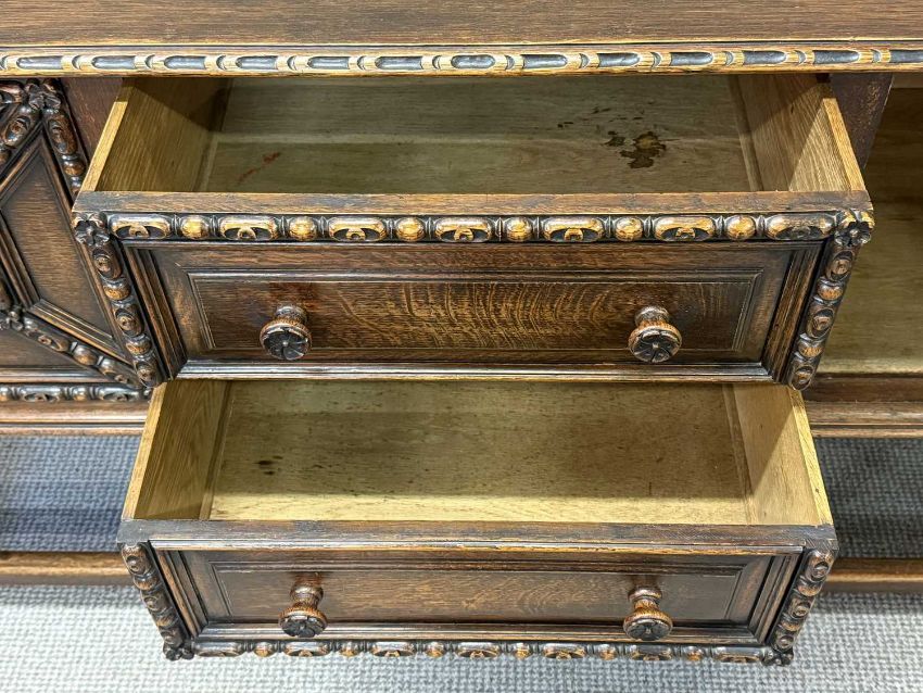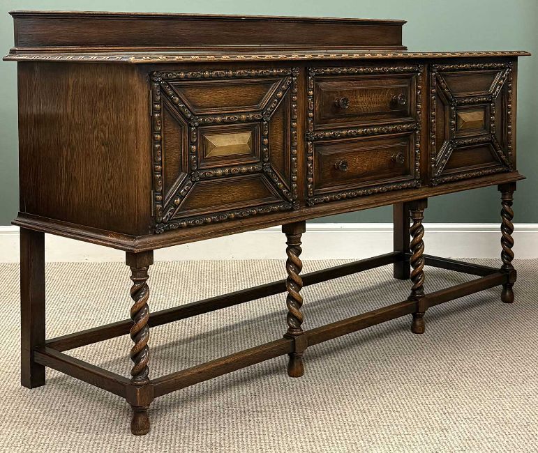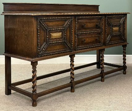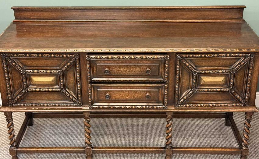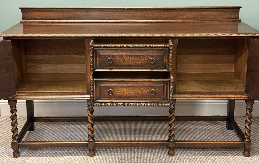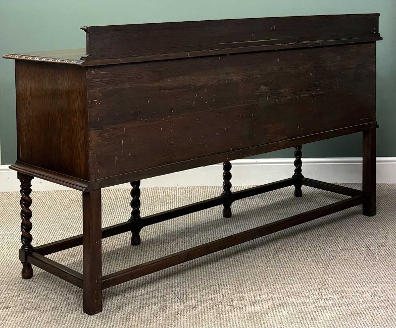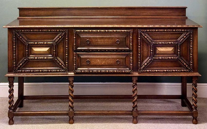 WARING & GILLOW OAK SIDEBOARD, with raised back, two centre drawers with cupboard to either side, all carved in relief with egg and dart moulding, turned knob handles, barley twist supports to the plain stretchers, 105 (h) x 183 (w) x 56cms (d)Provenance: private collection Gwynedd
