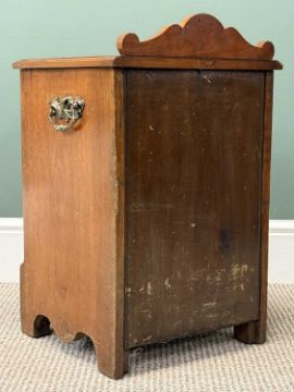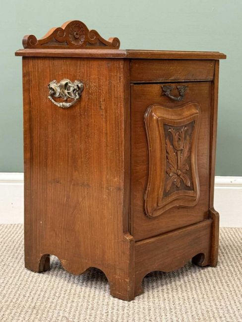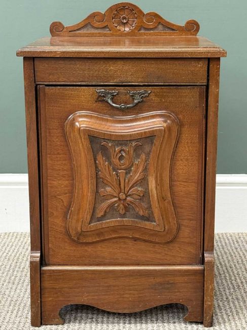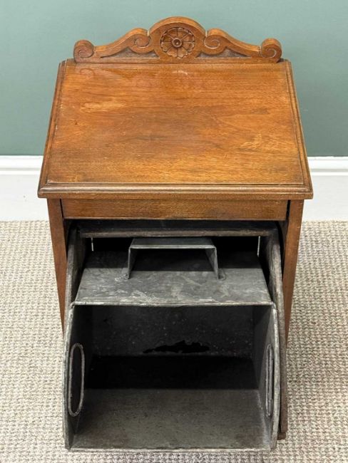LATE 19TH CENTURY WALNUT COAL BOX, relief carved fall front enclosing liner, 61 (h) x 38 (w) x 35cms (d)Provenance: private collection Gwynedd