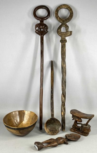 TRIBAL ART, including Luba carved wood headrest, the support carved with a figure and drum, 15cms (h); Asante type carved wood fertility figure, 31cms (h); two chieftain's staffs, one carved with an elephant, 90cms (l), etc.Provenance: private collection Ynys Môn