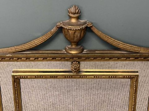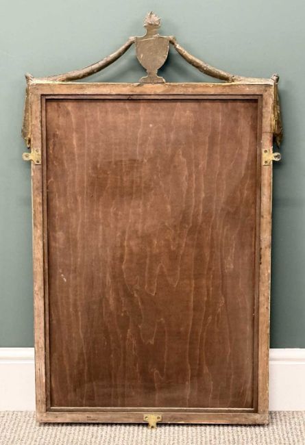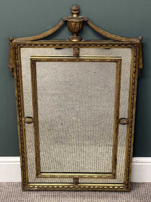 19TH CENTURY GILT FRAMED RECTANGULAR WALL MIRROR, urn pediment with drapes, segmented plate, 100 (h) x 61cms (w)Provenance: private collection Ynys Môn
