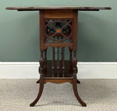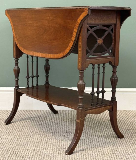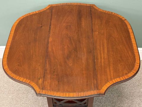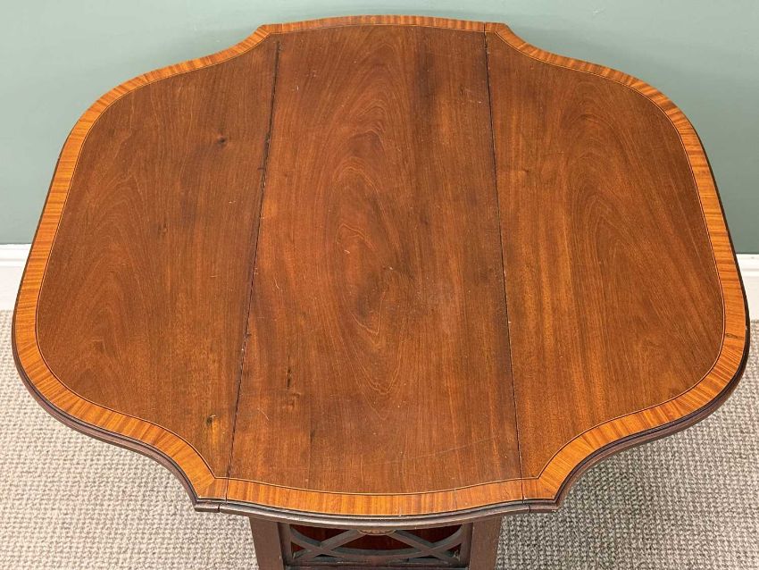 QUALITY EDWARDIAN MAHOGANY SUTHERLAND TABLE, cross-banded and strung, shaped oval top with drop leaves, spindle turned end supports united by an undertier, 69 (h) x 77 (w) x 76cms (d)Provenance: private collection Conwy