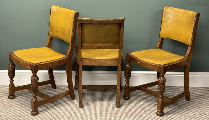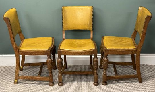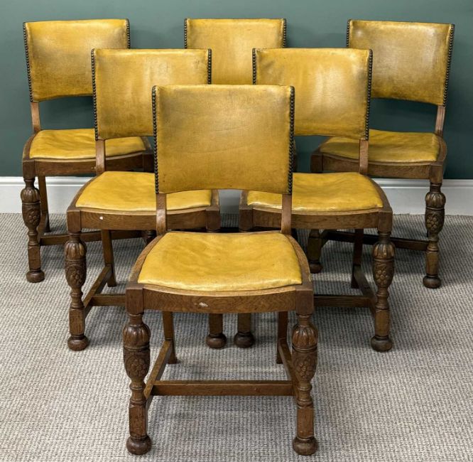 SET OF SIX OAK FRAMED DINING CHAIRS, studded upholstered vinyl backs and drop-in seats, turned frontal supportsProvenance: private collection Gwynedd