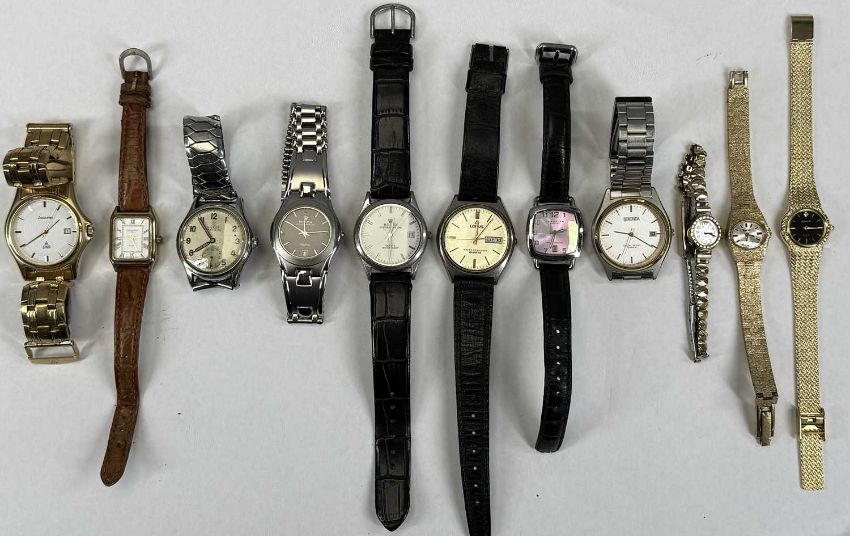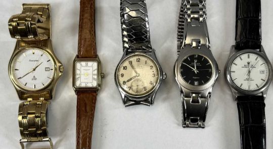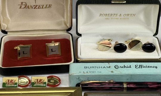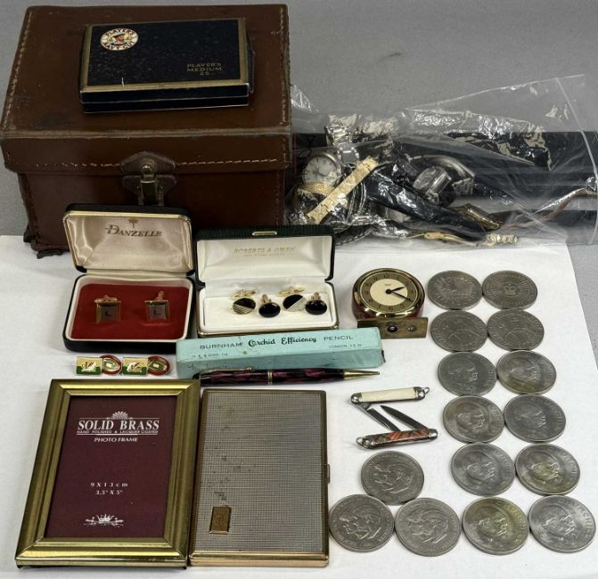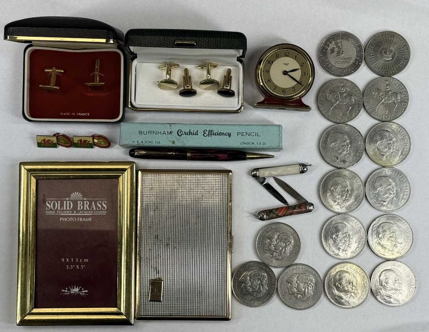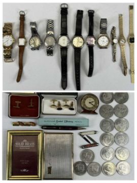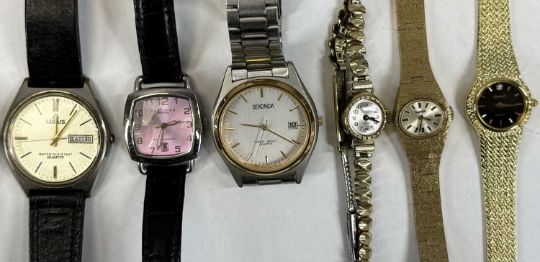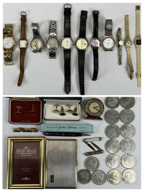 VARIOUS WRISTWATCHES & OTHER COLLECTABLES, Accurist quartz gold plated gent's wristwatch, Avia 9ct gold cased ladies' wristwatches, two gold plated ladies' wristwatches, various others, cufflinks, miniature Smiths mantel clock, various commemorative £5 coins / crowns, Burnham 'Orchid Efficiency' pencil in box, etc.Provenance: private collection Gwynedd
