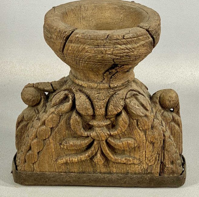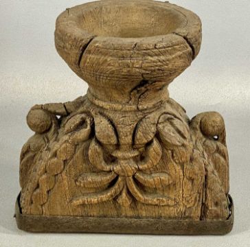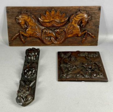 ASSORTED TREEN / DECORATIVE WOODEN ITEMS, including three Victorian textile printing blocks; oak wall hanging carved with two horses and shell motif, 23 x 52cms; bas-relief carved walnut panel, depicting a farmer with stick and badger, 23cms, etc.Provenance: private collection Ynys Môn