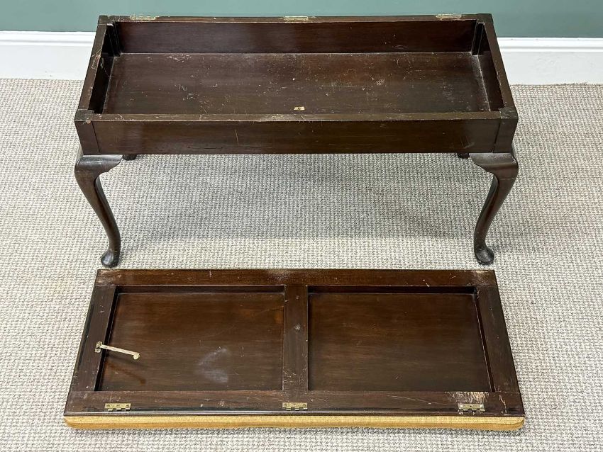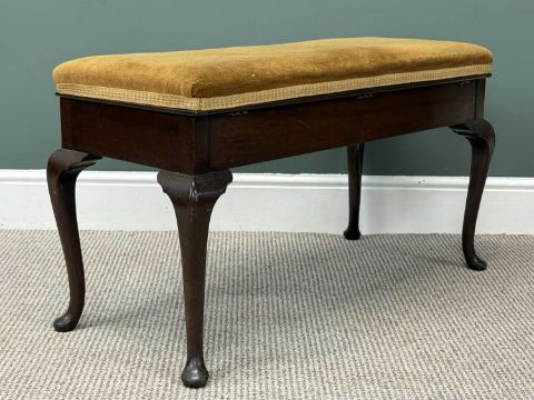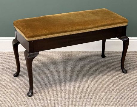 MAHOGANY FRAMED DUET STOOL, mustard dralon upholstered hinged seat, cabriole supports, 54 (h) x 94 (w) x 40cms (d)Provenance: private collection Conwy
