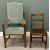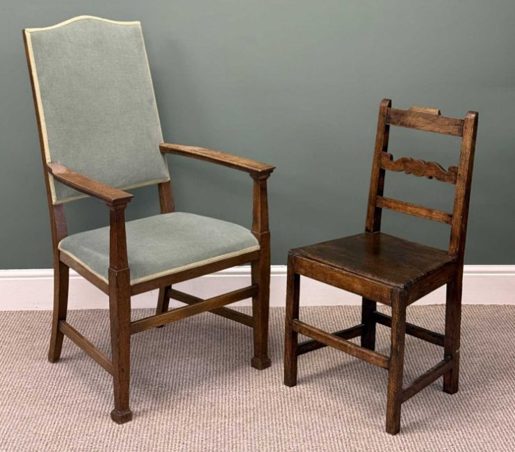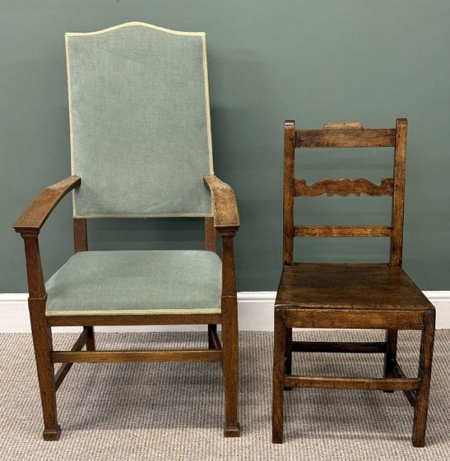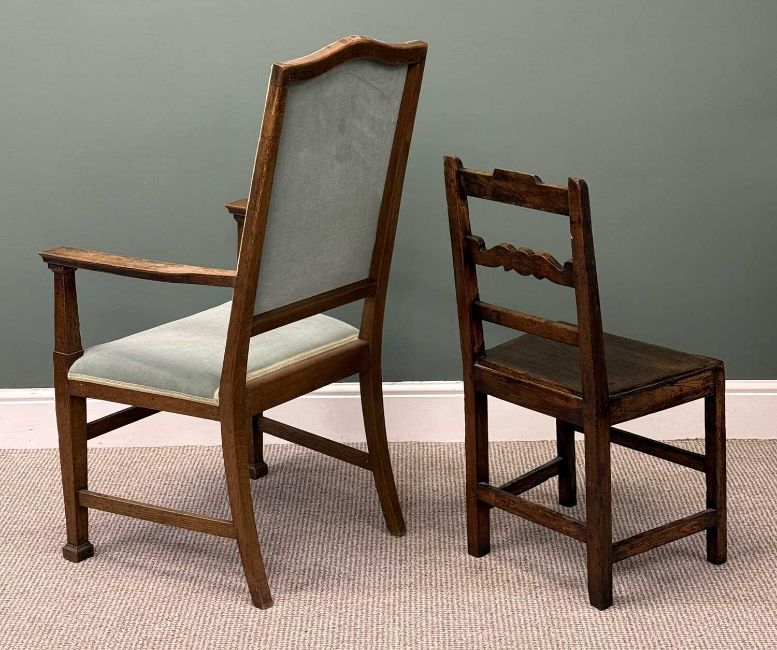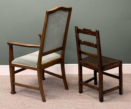 TWO OAK CHAIRS, oak framed open armchair with dralon upholstered arch back and seat, 115 (h) x 62 (w) x 60cms (d); and oak bar back farmhouse chair, 88 (h) x 46 (w) x 38cms (d)Provenance: private collection Cheshire
